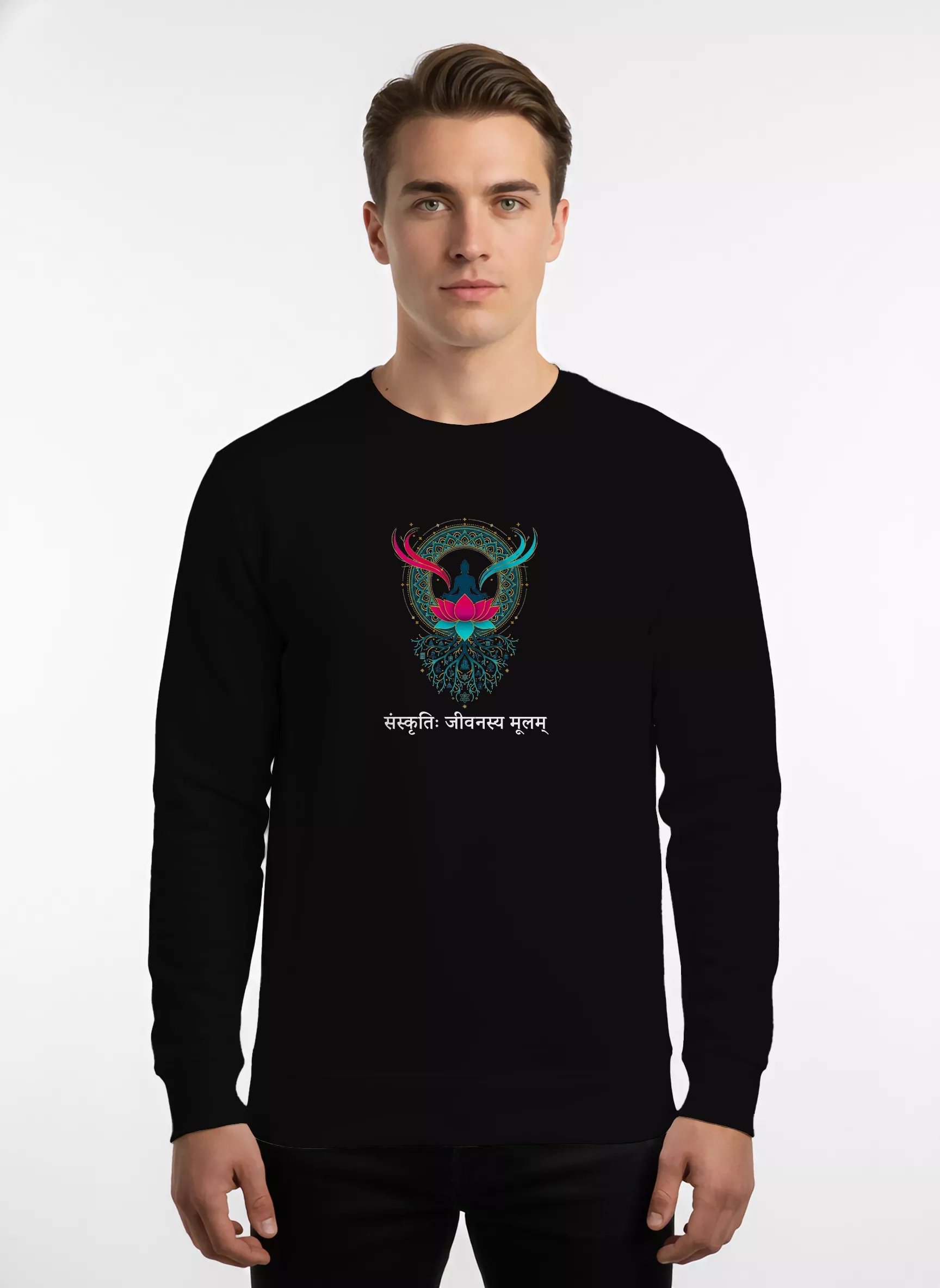 Celebrate your heritage with the Sanaatani Sanskriti Jeevanasya Mulam Sweatshirt. In a rapidly changing world, our culture (Sanskriti) acts as the anchor that keeps us grounded. This design features the powerful Sanskrit wisdom: “Sanskriti Jeevanasya Mulam,” meaning “Culture is the Root of Life.”